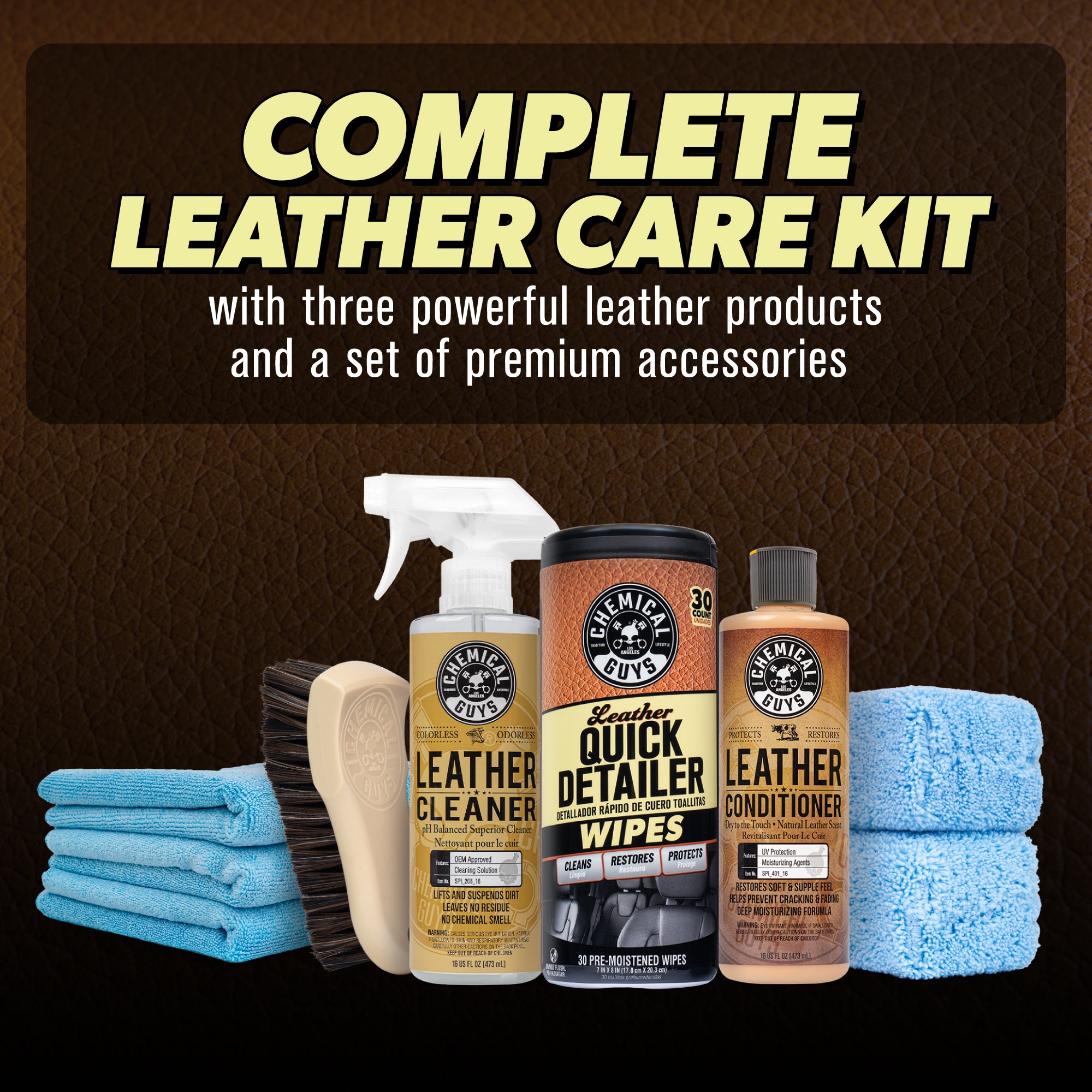 This complete leather care kit includes everything you need to clean. condition. protect. and maintain your leather surfaces. including Leather Cleaner and Leather Conditioner. Also included are premium accessories to get the job done right and Leather Quick Detailer Wipes so you can easily tackle on-the-go spills and messes.?