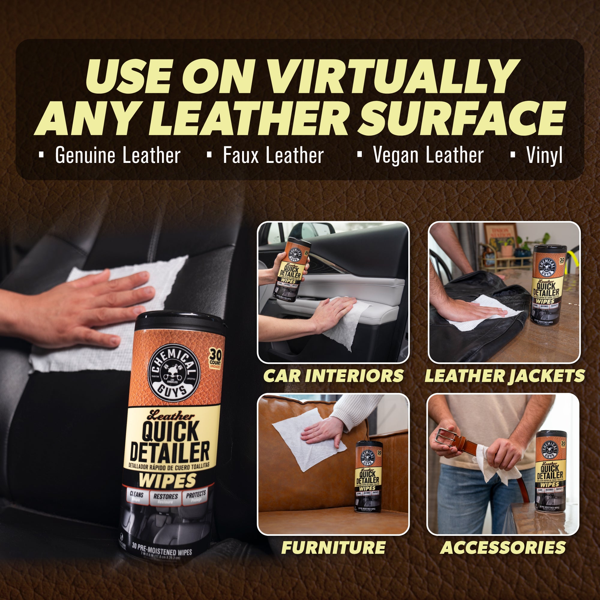 Enjoy three times the on-the-go leather detailing fun with this three-pack of ready-to-use. pre-moistened wipes that feature an advanced high-performance texture weave. Easily clean. restore. and protect various leather surfaces in your ride and elsewhere!?