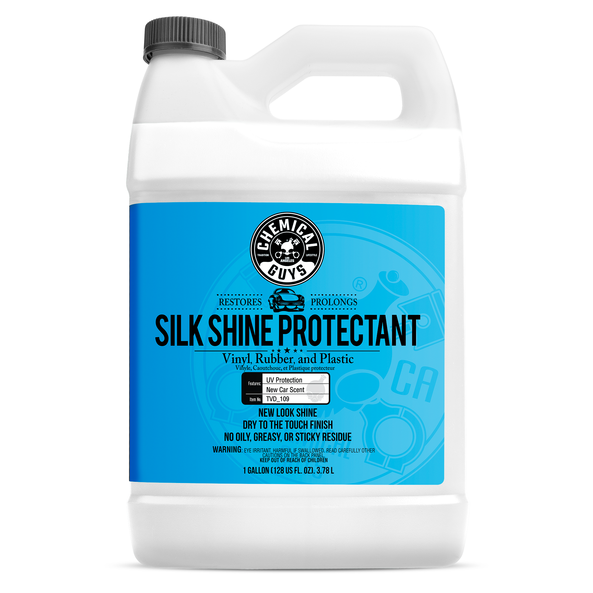 Silk Shine is a sprayable water-based dressing that restores a like-new look with a silky finish. It’s perfect for beautifying and preserving interior and exterior vinyl. rubber. and plastic without leaving a greasy wet shine.